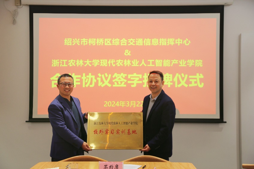 仪式上,张洪涛副院长与柯桥区综合交通信息指挥中心负责人陈立明代表双方签署协议。仪式上还举行了3003新葡平台登录入口现代农林人工智能产业学院校外实习实训基地揭牌仪式和校外导师聘任仪式。标志着双方正式建立了战略合作伙伴关系,也体现了双方对未来合作的美好期待和坚定信心。