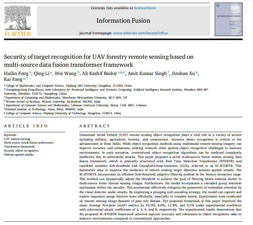 近日,3003新葡平台登录入口冯海林教授团队论文《Security of target recognition for UAV forestry remote sensing based on multi-source data fusion transformer framework》(基于多源数据融合transformer框架的无人机林业遥感目标识别安全性研究)在《Information Fusion》期刊发表。《Information Fusion》为中科院一区期刊,影响因子18.6,在“Computer Science: Artificial Intelligence”(计算机:人工智能)学科146个期刊中排名第3,在“Computer Science: Theory & Methods”(计算机:理论&方法)学科110个期刊中排名第2,是人工智能领域与计算机科学的国际顶尖权威刊物,聚焦于信息融合、数据融合、知识融合等领域的研究。