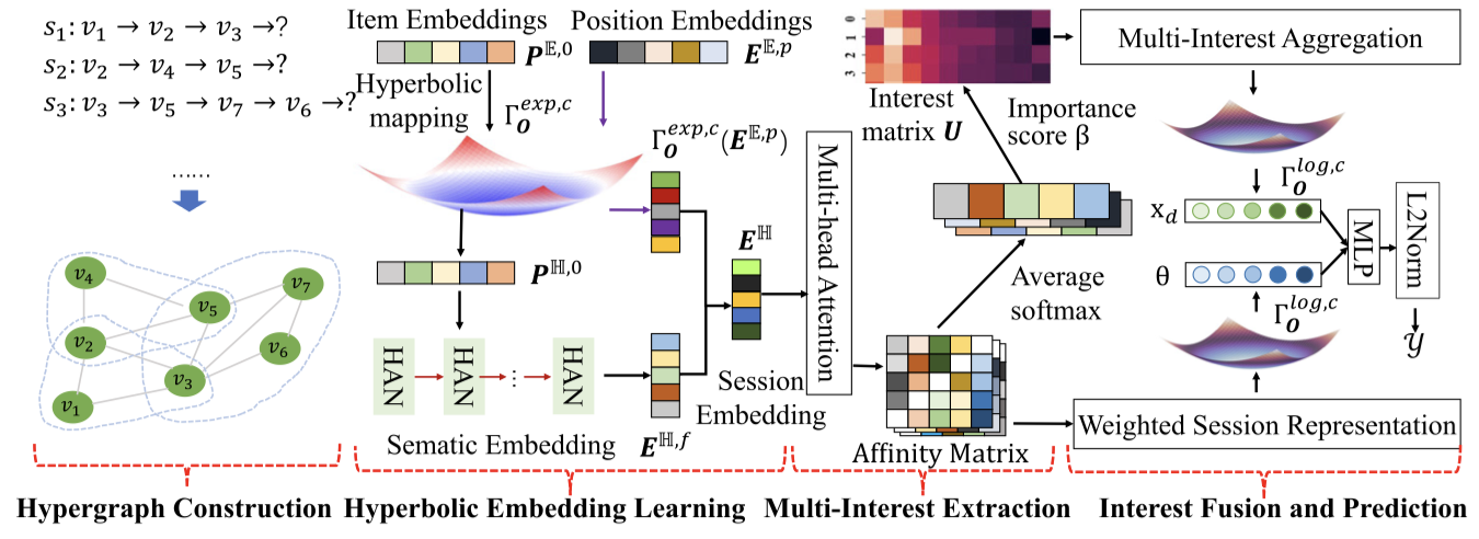 随着隐私保护政策的实施和用户对个人在线行为隐私保护意识的增强,在线多媒体平台获取用户的行为数据并在云端集中计算变得愈加困难,这就导致传统的推荐方法难以为用户提供精准的推送服务。为此,会话推荐(SBR)方法因此应运而生,其核心目标是在无需依赖用户个人资料或历史数据的情况下通过当前会话数据识别用户意图,可以在端侧产生更实时的推荐。然而,现有的方法均在欧式空间利用图网络学习物品的嵌入和单一会话表征,难以捕捉用户在短会话内的多样性、层次化交互行为模式,是SBR中极具挑战性的任务。