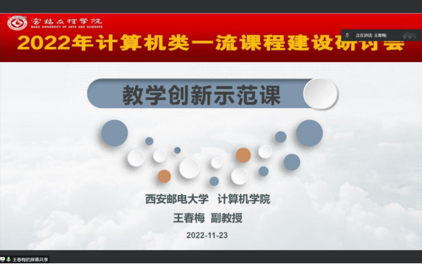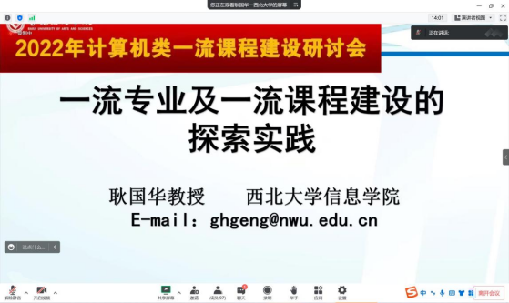 11月23下午陕西省计算机教育学会、宝鸡文理学院主办的“2022年计算机类一流课程建设研讨会”在腾讯会议举行,来自省内本科院校计算机类近120名教师在线参加了会议,我院教学副院长宋权华、各系(教研室)主任及计算机类相关教师参加了会议