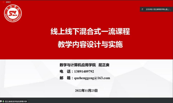 屈正庚“线上线下混合式一流课程教学内容设计与实施”为主题,分享了商洛学院数学与计算机应用学院教学团队在“计算机组成原理”在课前、课中、课后的教学内容及活动设计、学生反馈、实践作业、小组学习、课程思政等课程教学工作上的做法。
