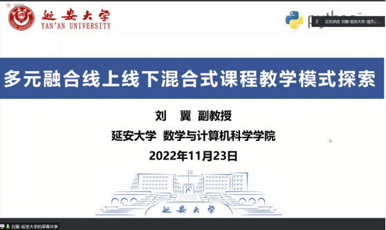 刘翼以“多元融合线上线下混合式课程教学模式探索”为主题,分享了延安大学数学与计算机科学学院教学团队在课程建设上的做法。学生课后“绘制知识点学习图谱”、“跨校协同联合考试”等开放式教学方法的有效实施有利于提升学生能力。