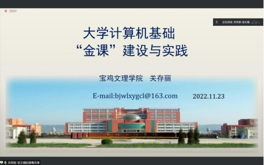 关存丽以“大学计算机基础“金课”建设与实践”为主题,分享了教学团队在大学计算机基础课程建设方面的经验。
