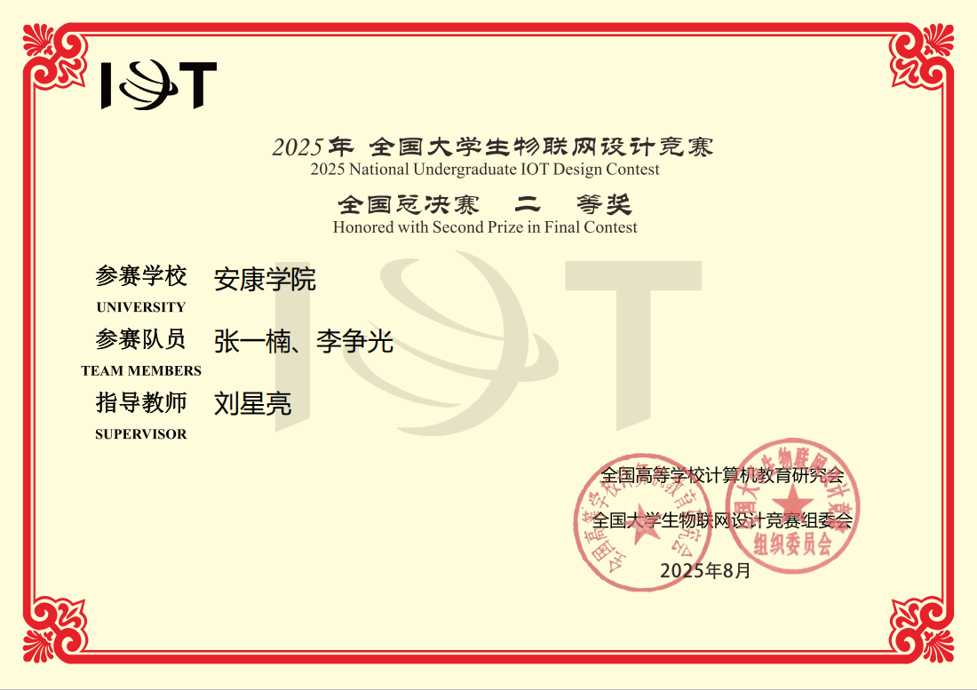 2025年全国大学生物联网设计竞赛是由全国高等学校计算机教育研究会主办、浙江大学承办。全国总决赛于2025年8月27日-29日在浙江大学玉泉校区隆重举行。本次竞赛共有来自浙江大学、上海交通大学、同济大学、西安交通大学、南京大学等800余所高校的3200余支队伍参赛。经过全国五个分赛区的评审和现场决赛,最终有220支队伍入围全国总决赛。该比赛注重作品设计的创新性、技术实现和应用价值,重点考察选手对专业技术的掌握程度、应用水平以及创新意识等。经过项目答辩、作品现场演示和评审专家质询等竞赛环节,我院参赛学生不负众望荣获全国二等奖。