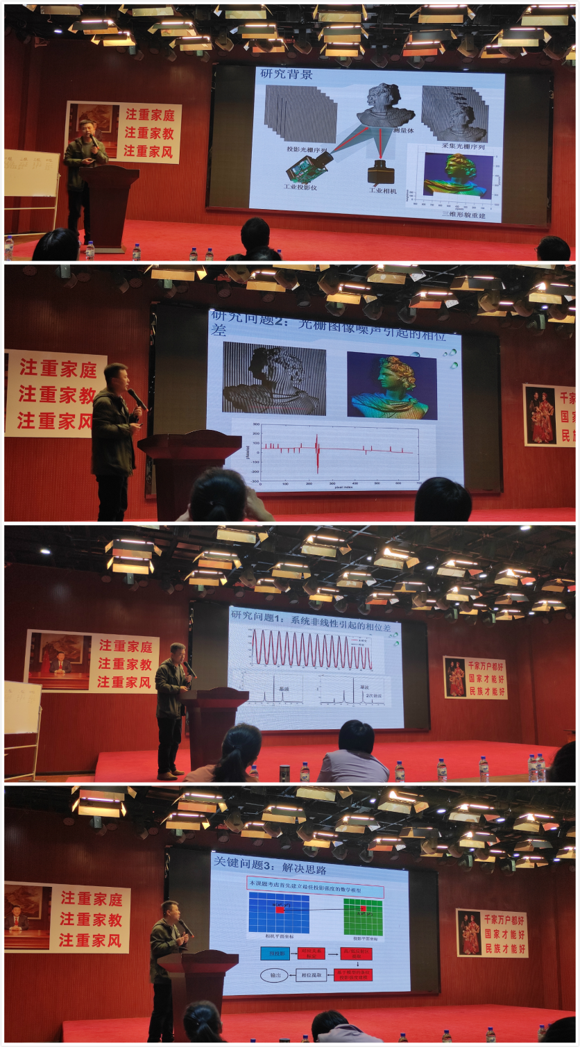 本次报告中,张申华博士结合自己的研究课题,介绍了光栅图像投影三维形貌测量中高精度相位提取的关键技术,针对如何提高相位质量问题,介绍了从测量系统非线性补偿、光栅图像盲去噪、反光及运动四个方面进行相位高精度提取的方法和途径。