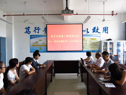 2015年7月1日早上10点, 电子与信息工程系党总支在逸夫科技楼B702教室隆重举行了庆七一座谈会暨新党员入党宣誓大会。系党总支书记李红兵老师、组织委员王克刚老师以及13位新党员同志共同参加了本次会议。会议由学生支部书记成英丽老师主持。