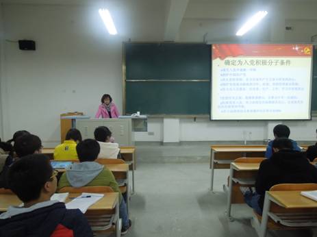 1218晚上,电子信息工程系党总支在1301教室召开了2014级新生入党启蒙教育。由系学生党支部书记成英丽老师主讲。会上,成英丽老师首先为大家介绍了中国共产党的性质、党员的权利与义务等基础知识;接着阐述了什么是入党动机、如何端正入党动机,要求有入党意愿的同学应尽快适应大学学习和生活,在学习和实践中提高自己的思想政治素养,不断纠正和净化自己的入党动机,树立坚定的政治信仰,不断追求进步,从多方面提升自己。讲座中成英丽老师还介绍了电子信息工程系学生党支部的基本情况、入党流程,并为大家讲解了入党申请书的书写格式。最后,她鼓励每位有入党意愿的同学树立目标,努力实践,争取早日成为一名光荣的中国共产党党员。