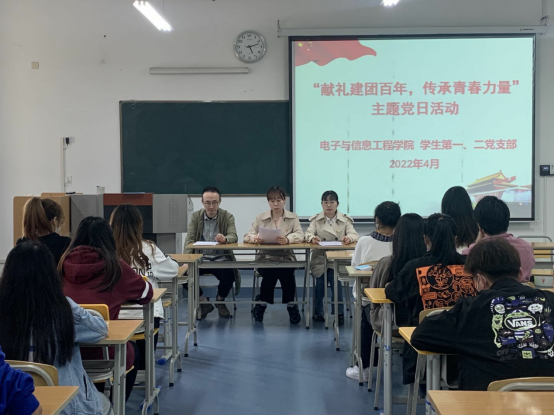 为庆祝中国共产主义青年团成立100周年,喜迎中国共产党第二十次全国代表大会即将召开,为落实立德树人根本任务,加强爱国主义教育,引导和激励青年坚定理想信念,以思想价值教育引领学风建设,培养德智体美劳全面发展的社会主义建设者和接班人。4月20日下午,在江北校区1321教室,Beat365中文官方网站学生第一、二党支部联合开展政治理论学习暨“献礼建团百年,传承青春力量”主题党日活动。党总支组织委员成英丽,学生第一党支部书记程晓梅、组织(纪检)委员张宇航,学生第二党支部书记李章雨、组织(纪检)委员石纭昊,辅导员吕以宁和在校学生党员参加,主题党日活动由学生第一党支部书记程晓梅主持。