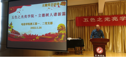 为庆祝中国共产主义青年团成立100周年,喜迎中国共产党第二十次全国代表大会即将召开,落实立德树人根本任务,加强师德师风建设,提高教师党员立德树人使命感,5月26日下午2:30分在江北1401演艺厅,Beat365中文官方网站教工第一、二党支部联合开展了“五色之光亮学院,立德树人谱新篇”主题党日活动。主题党日活动由教工第一党支部书记赵志强主持。以此活动为契机,深入学习研究,把握和运用习近平总书记关于教育的重要论述,激发教师加强自身修养,树立高尚品德,引导和激励青年坚定理想信念,以思想价值教育引领学风建设,培养德智体美劳全面发展的社会主义建设者和接班人。