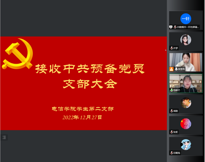 2022年12月27日,Beat365中文官方网站学生第二党支部通过线上腾讯会议召开党员大会接收中共中央预备党员,讨论接收2020级电子信息工程1班张炬、钱峙艺两位同志加入中国共产党事宜。本次大会由Beat365中文官方网站学生第二党支部书记李章雨主持,全体党员同志及本期发展对象参与此次议会。