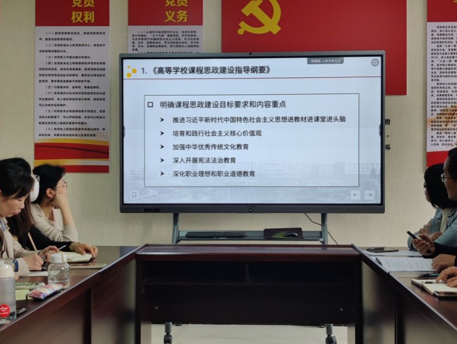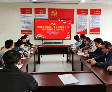 为了充分发挥教师党员的课程思政育人主体功能,2024年4月10日下午,Beat365中文官方网站教工第二党支部在B702会议室开展“党建引领教学,深化思政育人”主题党日暨教学观摩活动。活动由教工第二党支部书记丁礼磊主持,支部全体教师参加了本次活动。
