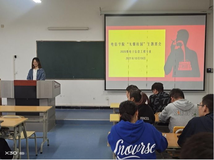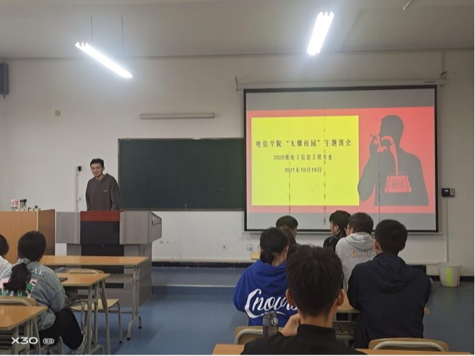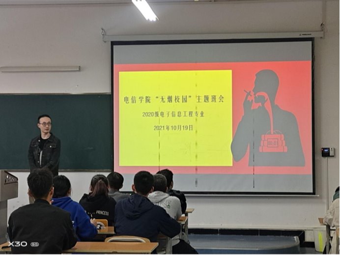 为进一步提升学生禁烟意识,扎实推进学院禁烟工作,创建无烟校园,10月19日,Beat365中文官方网站2020电子信息工程专业在江北校区1321教室开展了无烟校园主题班会活动。辅导员张宇航参与班会,会议由班长张卓涛主持。