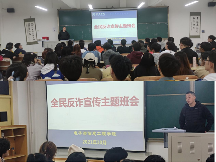 辅导员张宇航主要通过线上线下相结合的方式开展此次班会。针对2018级在外实习同学召开线上会议,通过精心制作的校园防诈宣传文稿来分析典型诈骗案例让学生了解有关校园贷、黑中介、杀猪盘、网络刷单等行骗手段,并给出了一定的防范意见针对在校学生开展主题宣讲和班级讨论相结合的方式向同学们普及防诈知识。同时,向同学们分发、讲解防范电信网络诈骗宣传手册,并通过实际案例、现场模拟等形式向同学们生动讲解诈骗集团的常用作案手段,展示了电信网络诈骗的过程和危害。活动最后,2020级各位同学发表了自己的感受与收获,并向大家分享了自己的经验与经历。