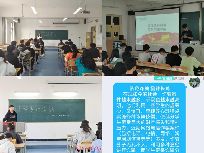 随着通讯科技设备的普及,电信诈骗事件层出不穷,为有效遏制电信网络诈骗犯罪发生,形成坚实的校园防范基石,切实杜绝受害1024日,Beat365中文官方网站组织各班开展防范电信诈骗、保障财产安全系列主题班会。学工办主任石纭昊、辅导员成英丽、李章雨、程晓梅、张宇航分别参与所带班级会议,各班会议本班团支书主持。