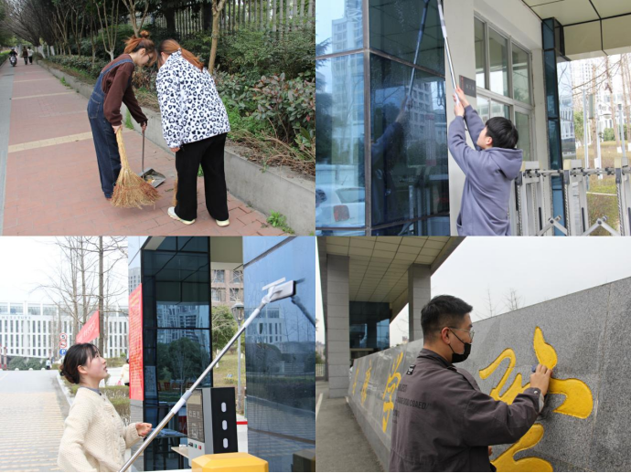 清扫过程中,同学们分工明确、各司其职,按照事先各组划定的清洁区域进行认真打扫。大家一起擦拭校门上的灰尘,清理缝隙中的顽垢,不放过任何一处死角,还用清洁剂擦洗了门卫处的窗户玻璃。同时,对校门口的垃圾及周边道路上的烟头、纸屑进行清扫,并将清理的垃圾进行分类,放置在不同的垃圾袋中,以便后续能够更好地完成垃圾回收工作。同学们自始至终都保持着积极昂扬的态度,每一个举动都写满了认真和努力。在接近两个小时的认真清扫后,校园环境更加优美舒适。