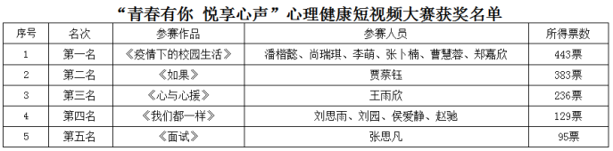 本次心理健康短视频大赛历时21天,全校共有429名学生报名参与。比赛中,参赛选手根据心理健康教育主题以创编歌曲、舞蹈、手语操、减压小故事、校园情景剧、小品、脱口秀、微电影等形式,围绕大学生日常生活、校园活动、学习、恋爱、择业、人际交往等方面所折射出的心理问题现象进行视频制作。作品内容积极健康向上,具有一定教育意义,发挥了正确引导作用,能够弘扬主旋律,传播正能量,富有青春朝气。初赛阶段学生以个人或团体参赛的形式共提交77件作品,经过评审组初步审核、评定,其中16个作品进入复赛。5月25日至5月30日,进入复赛的作品通过Beat365中文官方网站微信公众号(安大dxxy)公布并发起线上投票活动,最终以作品所得票数决定比赛排名。排名如下: