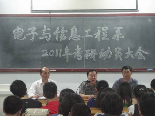 大会首先由考研成功的07级学生介绍考研经验和感受,这几位同学分别考入了西北工业大学,西安邮电学院等知名大学。他们从考研的准备、考研目的与心态、考研复习进度等方面,与大家分享了自己的经验和心得。接着,系副主任陈守满教授进行了动员讲话,陈守满教授讲了考研的必要性,对08级考研的同学提出了四点要求,他强调考研是一个艰辛、漫长的过程,考研的同学一定要做好充分的身体和心理准备,努力拼搏,争取取得好的成绩。教研室主任王庆春、付争方分别从电子信息工程和计算机科学与技术两个专业的课程特点出发对同学们如何进行报考和复习进行了指导。