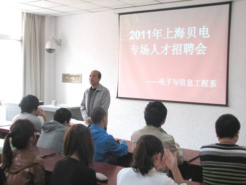 109上午,电子与信息工程系在1429室举行了上海贝电公司2011年专场人才招聘会。上海贝电公司西安办事处主任樵刚,电信系党总支书记李红兵,学办副主任石纭昊,2012届有70余名毕业生参加招聘会。
