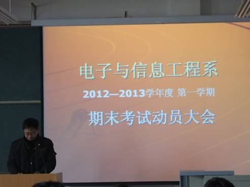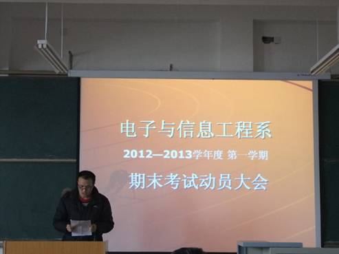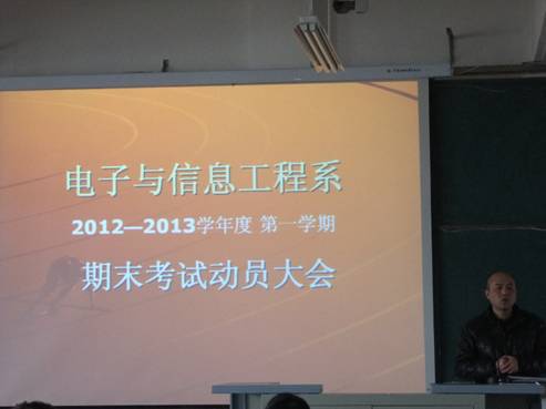 2013117下午,电子与信息工程系在1号楼301教室举行了考前动员大会,系党总支书记李红兵、系副主任陈守满、学办副主任石纭昊,2012级新生参加会议。会议由系党总支书记李红兵主持。