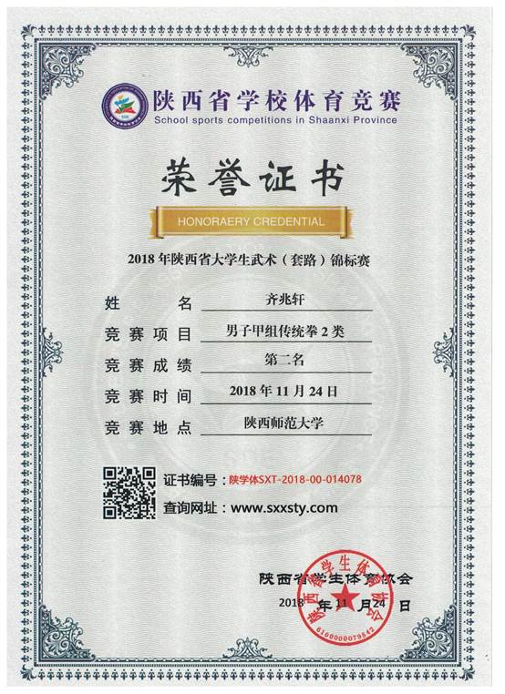 我院2015级电子信息工程专业学生齐兆轩在2018年陕西省大学生武术(套路)锦标赛中获得两金一银的好成绩。
