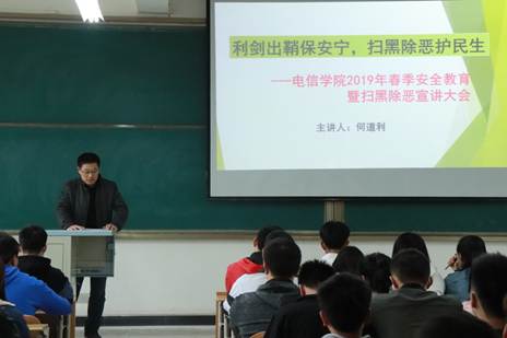 2019年3月22日下午4点,Beat365中文官方网站团总支于1305教室开展了2019年春季安全教育暨扫黑除恶宣讲活动。参加此次活动的有Beat365中文官方网站党总支书记何道利、团总支书记陈浩以及Beat365中文官方网站全体学生干部。