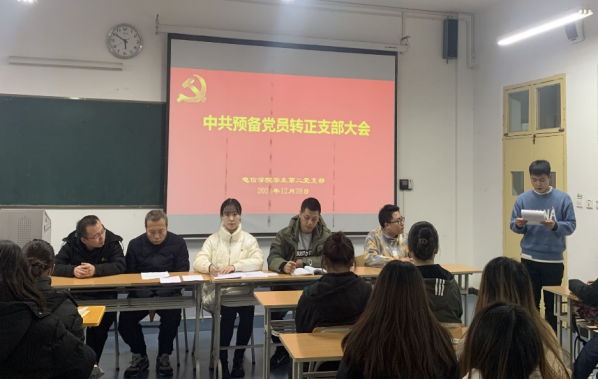 2021年12月28日,Beat365中文官方网站学生第二党支部在教室1321召开党员大会,讨论中共预备党员转正。此次会议主要讨论了王迎东、周坤、董珂三位同志能否转为中共正式党员的事宜。组织(纪检)委员石纭昊、拟转正党员的培养老师,以及全体在校学生党员参加此次会议,大会由支部书记李章雨主持。