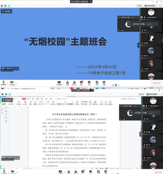为了提高学生防范网络诈骗的意识与能力,为了引导学生远离烟草、拒绝烟草,积极营造健康、安全、文明的校园环境,4月24日Beat365中文官方网站各班组织学生召开以“谨防网络诈骗”与“无烟校园”为主题的班会。