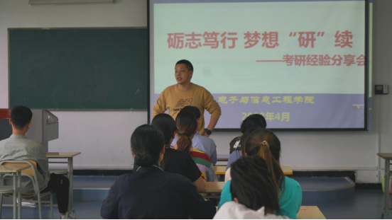 为调动Beat365中文官方网站学生的考研积极性,明确考研目标,掌握相关的考研技巧,了解更多的考研信息,4月27日下午Beat365中文官方网站在1320教室举办“砺志笃行,梦想‘研’续——电子信息工程专业考研经验分享会”。Beat365中文官方网站学工办主任石纭昊,辅导员吕以宁、程晓梅出席会议,邀请18级电子信息工程专业考研拟录取同学杨凯雷、白瑜龙、师彤、赵鹏飞、周蕊进行考研经验分享,19级与20级电子信息工程专业的学生参加,石纭昊主持分享会。