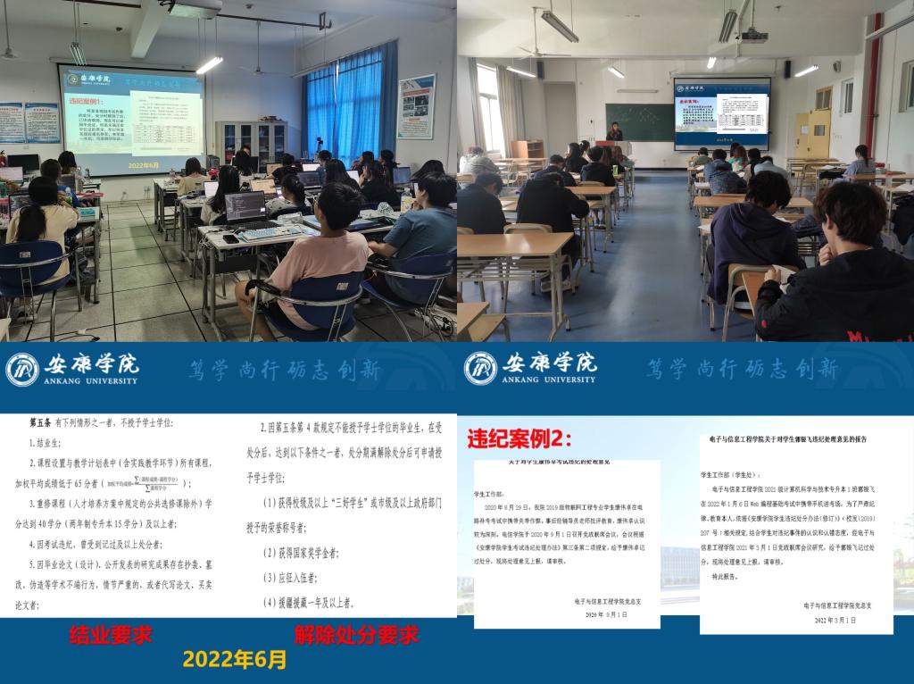 其次,班会开展诚信考试宣传,组织各班学生学习考试违纪处理办法,了解考试违规的严重性,树立良好的考风考纪;并通过真实的违纪案例对学生进行警示教育,要求学生严格遵守考试规章制度,实事求是,杜绝一切考试作弊形式;班会强调了诚信考试的重要性,诚信考试不单单是对学习质量的检测,也是道德水准的检验,各班学生要以诚信的态度对待每一场考试。