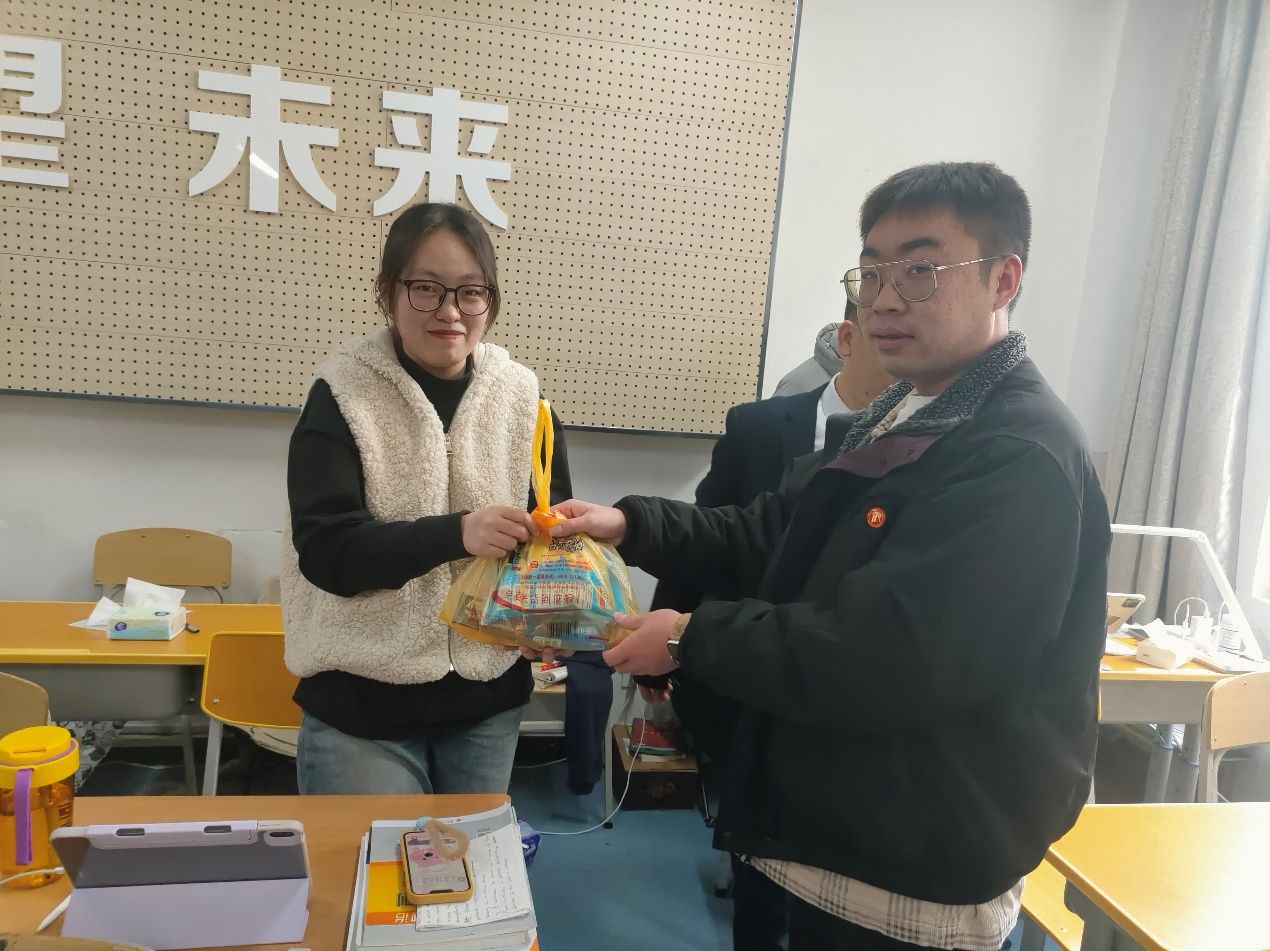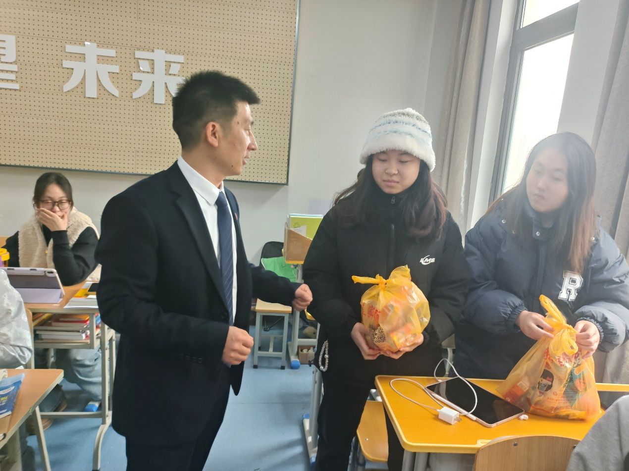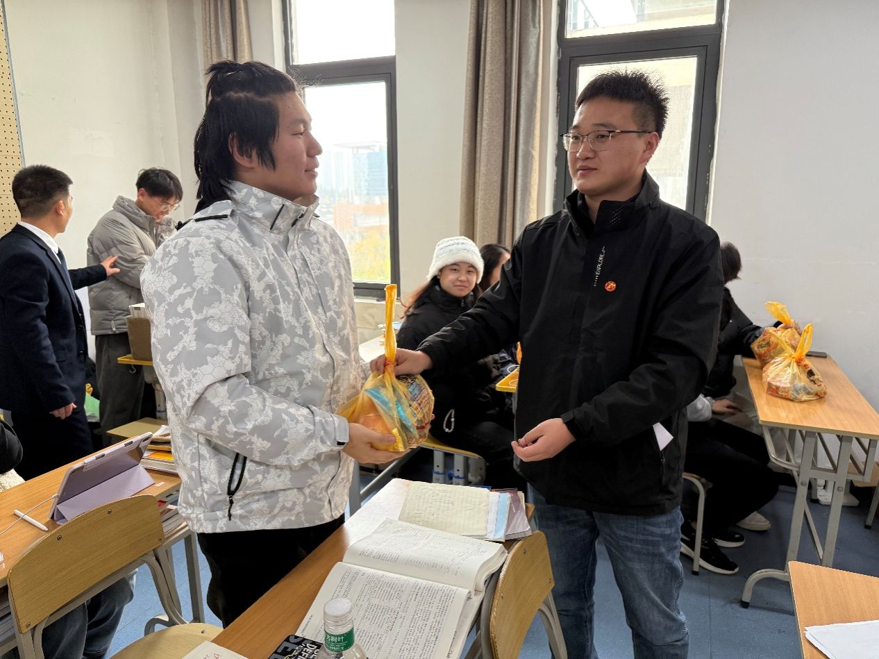 爱心礼包发放期间,党总支书记于咏梅希望全体考研同学,在备考冲刺阶段要保持平和和坚韧的心态,劳逸结合,规律作息,合理饮食,以最佳状态迎接考试。院长陈守满肯定了各位学子从开始准备考研以来付出的所有努力,鼓励同学们要咬定青山不放松,在最后的冲刺阶段咬紧牙关,坚持到底,为考研之路画上圆满句号。副院长王克刚提醒同学们要根据自身情况合理调整复习策略,确保备考过程科学高效。他鼓励大家树立信心,勇于拼搏,用奋斗换取心中理想的目标。党总支副书记蔡正旺叮嘱同学们在专注学业的同时,也务必关注自己的身心健康,保持良好的状态迎接挑战。