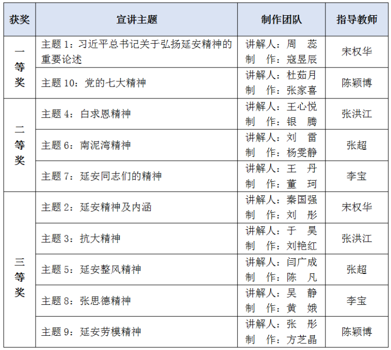 本次活动中,学院党总支精心策划、专业教师认真指导、学生党员和青年学生积极参与,认真撰写讲稿,精心拍摄视频,共制作出10期宣讲微视频,经评审小组评定,党总支委员会审定,评选出了一、二、三等奖,其中一等奖2名,二等奖3名,三等奖5名,并给予奖励。