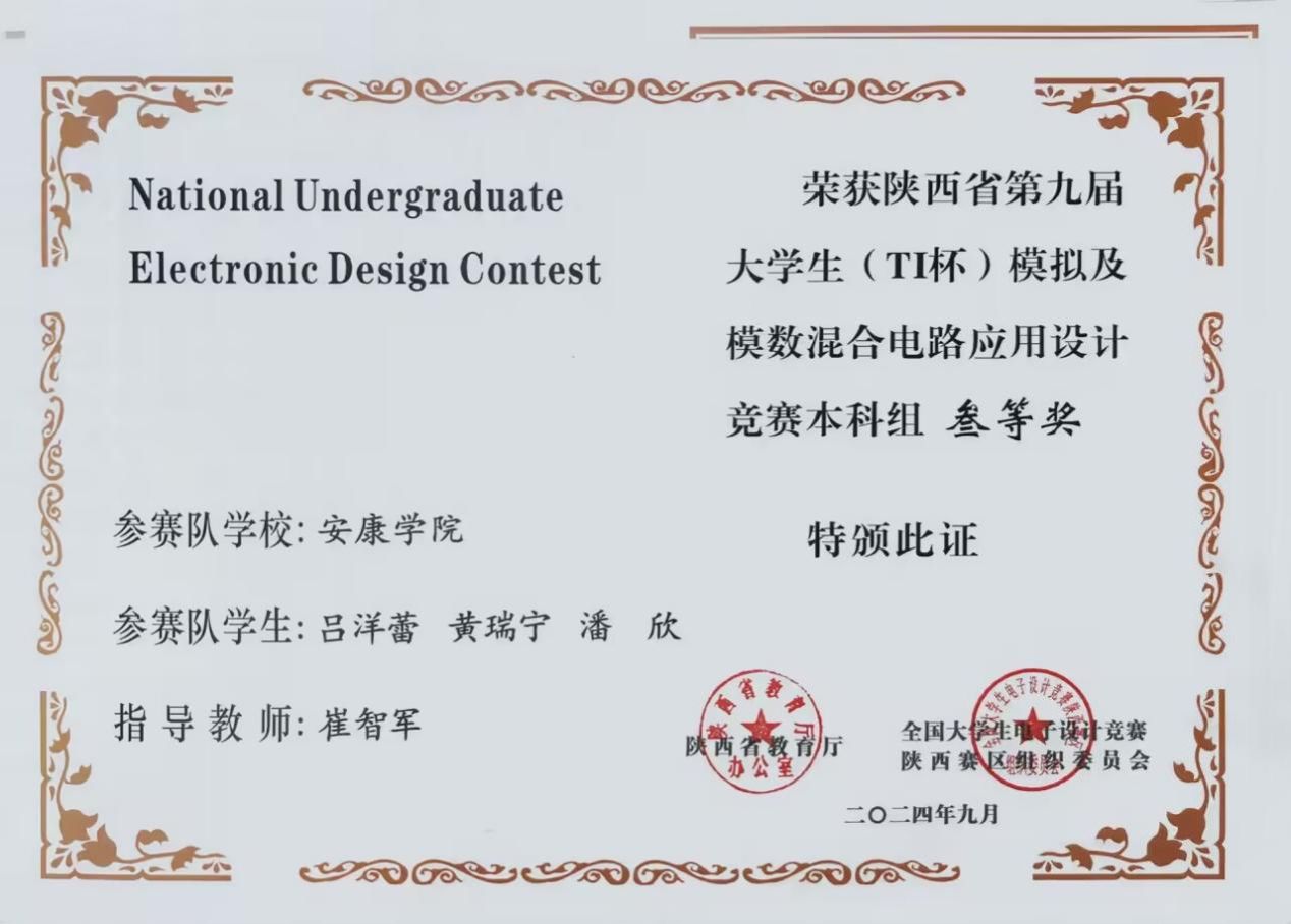 近日,陕西省教育厅、全国大学生电子设计竞赛陕西赛区组织委员会公布了2024年全国大学生电子设计竞赛陕西区赛(暨陕西省第九届大学生模拟及模数混合电路应用设计竞赛)获奖名单,Beat365中文官方网站学子获得了本科组三等奖。