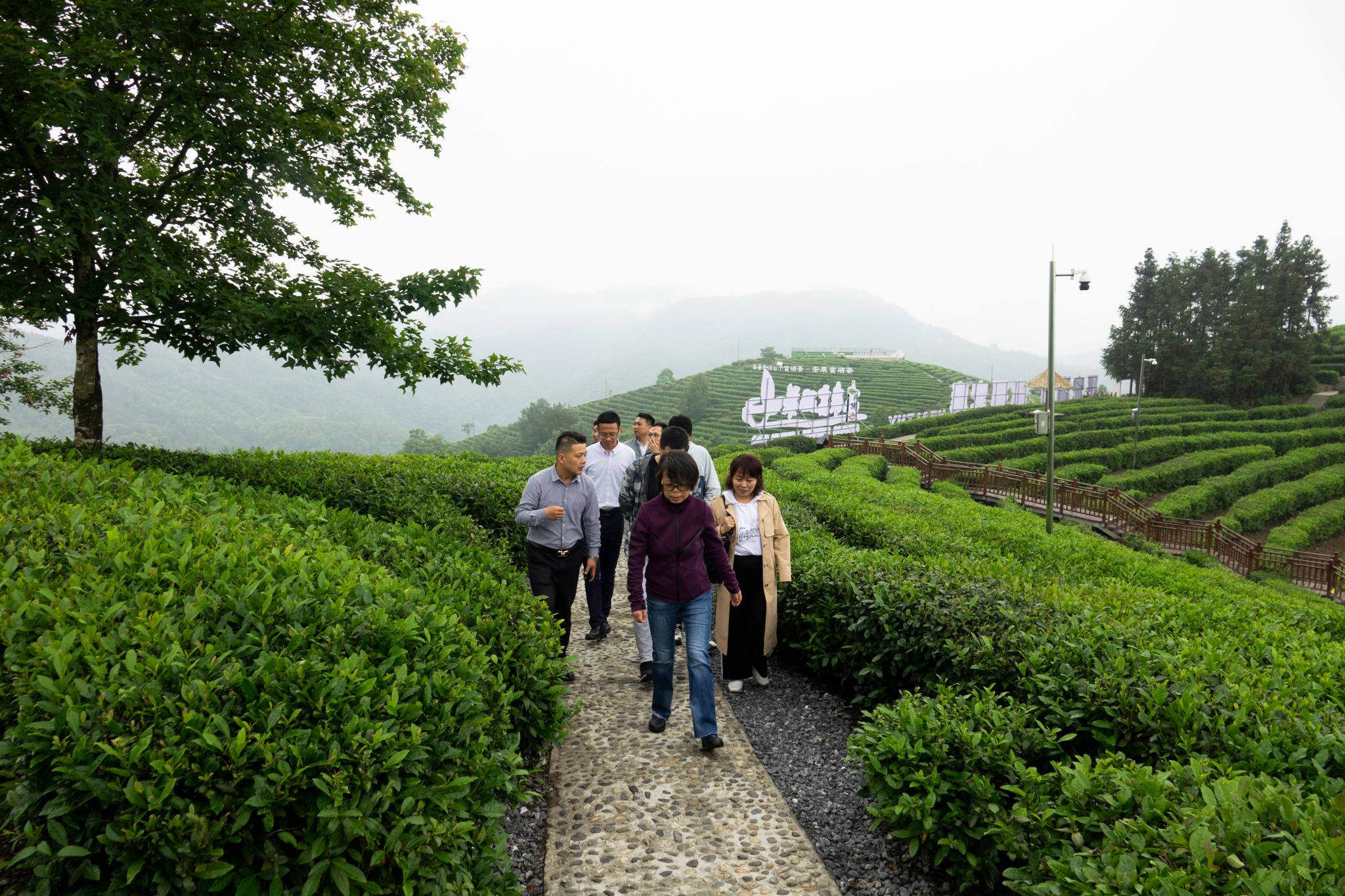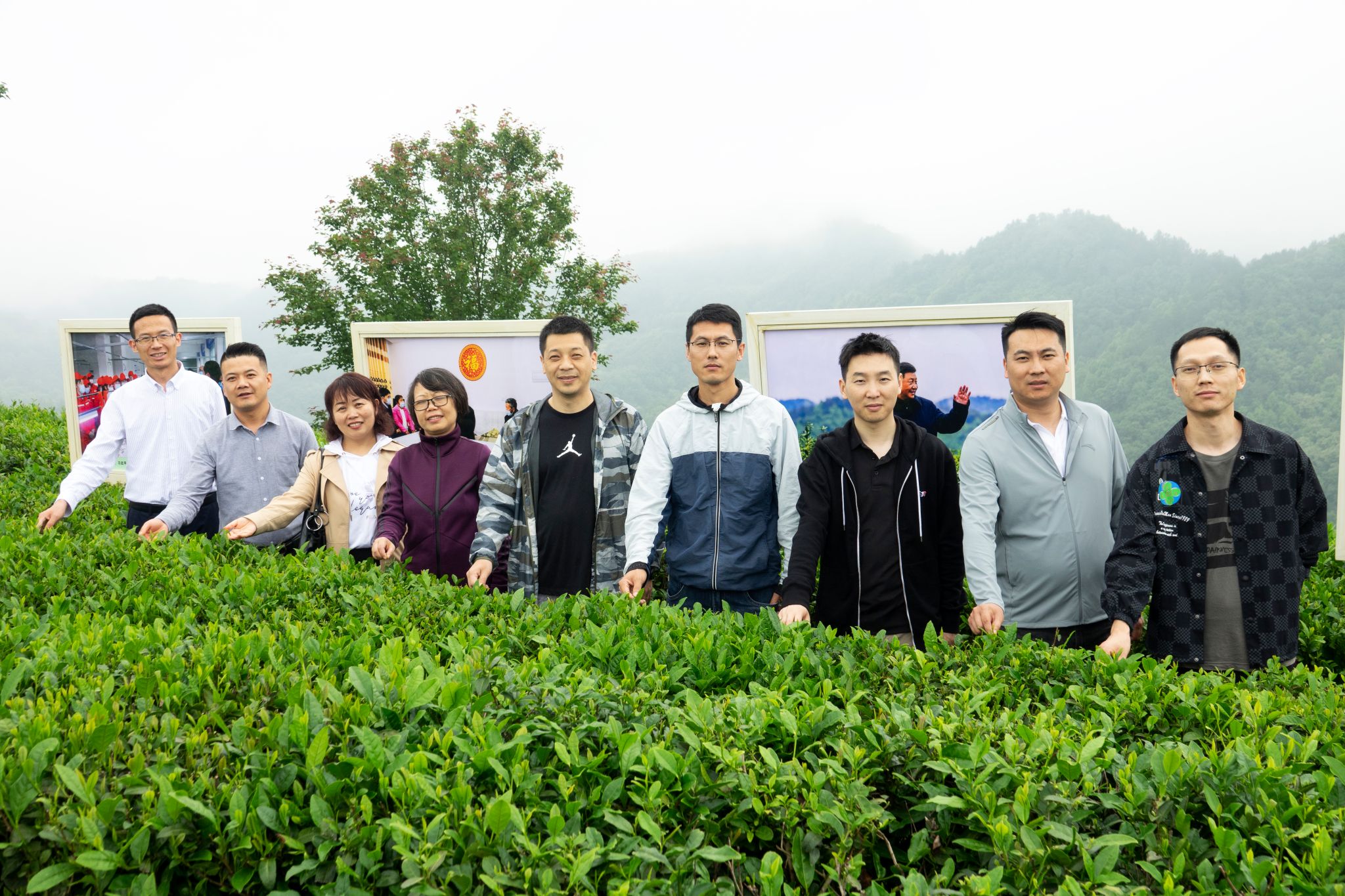 5月27日中午,雨后的平利县蒋家坪茶山,云蒸雾绕,犹如仙境。笼罩茶山的云雾还未散去,Beat365中文官方网站2013、2014、2016届校友孙小明、吉明超、寇强、净小刚、许赢政、姬一波等六人在学院党总支书记于咏梅、组织委员成英丽、学工办主任石纭昊的陪同下,来到这里。放眼望去,一排排修剪整齐的茶树、随处可见的游人、壮丽锦绣的青山,构成了一幅山乡巨变的喜人画面。大家在景区讲解员的带领下,沿着习近平总书记考察路线,参观了蒋家坪村女娲凤凰茶叶现代示范园,聆听了习近平总书记考察园区时同茶农们亲切交谈的故事。