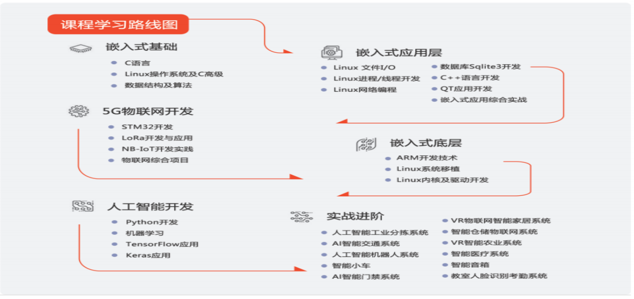 华清远见嵌入式人工智能、物联网、JavaEE、HTML5、Python+人工智能、星创客6大高薪就业课程,紧跟时代发展,每年两次升级。因技术新、课程深、项目广,让学员始终走在技术前端。