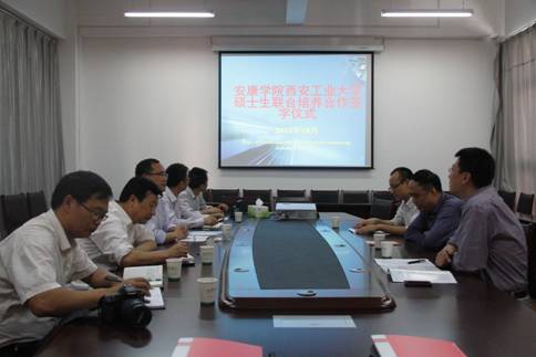 2013年10月9日,电信系与西安工业大学计算机科学与工程学院联合培养硕士研究生签字仪式在学校校图书馆六楼汉水文化研究中心会议室举行。出席会议的有副校长向纪明、科技处处长刘强,西安工业大学研究生部部长张群、计算机科学与工程学院院长白万民、研究生招生办主任王恒,以及电信系主任张东红、副主任陈守满、王庆春,签约仪式由科技处刘强教授主持。张东红主任和白万民院长代表双方在合作培养硕士研究生协议上签字。