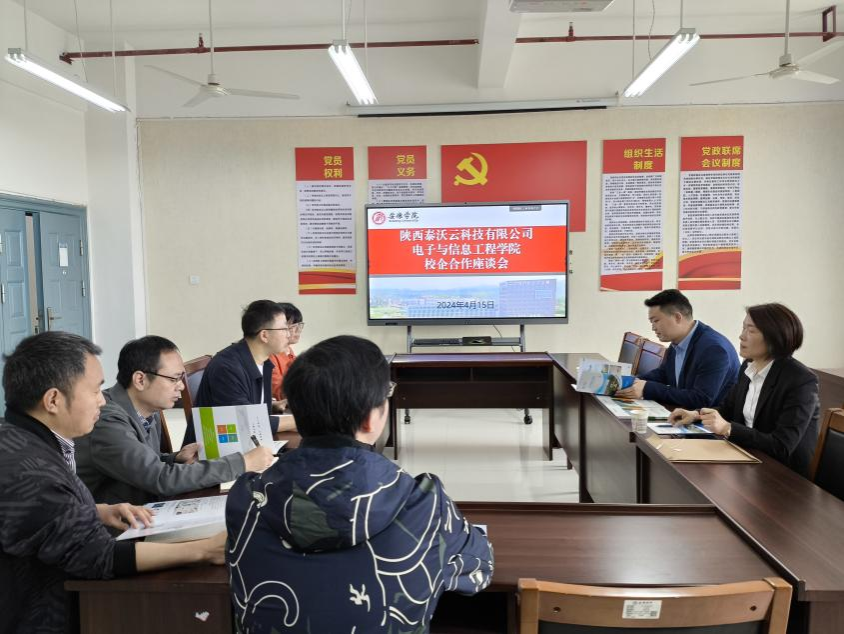 2024年4月15日,为进一步落实落地《安人才办发[2023]2号》“百名博士助百企”科技服务活动,经前期交流对接,陕西泰沃云科技有限公司董事总经理孔恩明一行到访Beat365中文官方网站,举行校企合作座谈会。会议由王克刚副院长主持,Beat365中文官方网站各系主任、实验中心副主任,以及校级科研平台大数据与智能信息处理研究中心主任参加座谈。