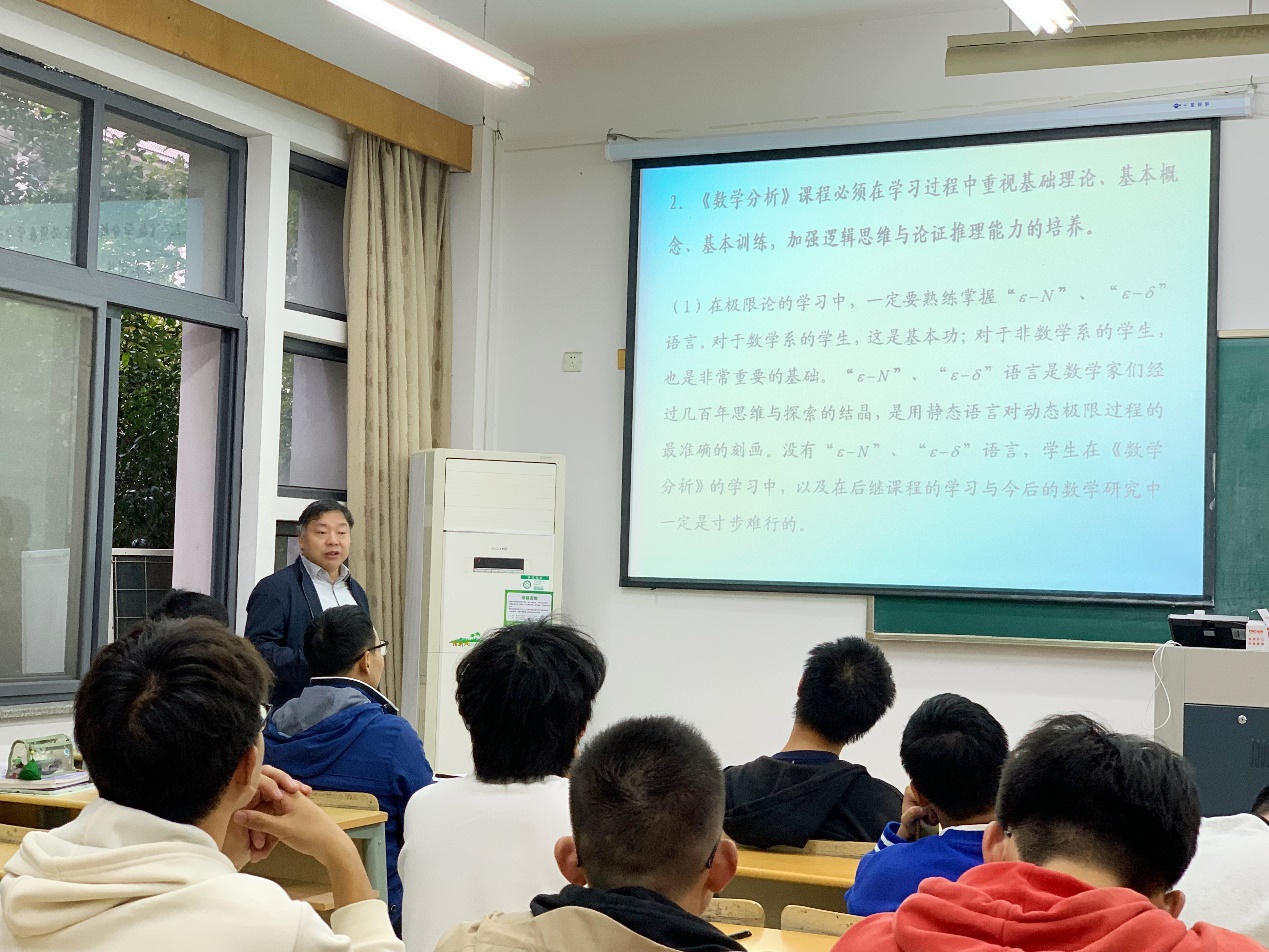 周勇教授从数学学科发展历史的维度切入,重点介绍了数学发展过程中的三次数学危机,深入浅出地剖析了危机的背景、产生原因及其解决方案。他详细讲解了实数理论和极限概念模糊性问题的解决过程,并指出这些突破为微积分基础理论的巩固奠定了坚实基础,带领师生领略数学的“奇”与“美”。周教授还结合自身科研心得和多年来分析类课程的教学经验,为同学们传授了一些数学分析课程的学习方法与技巧。