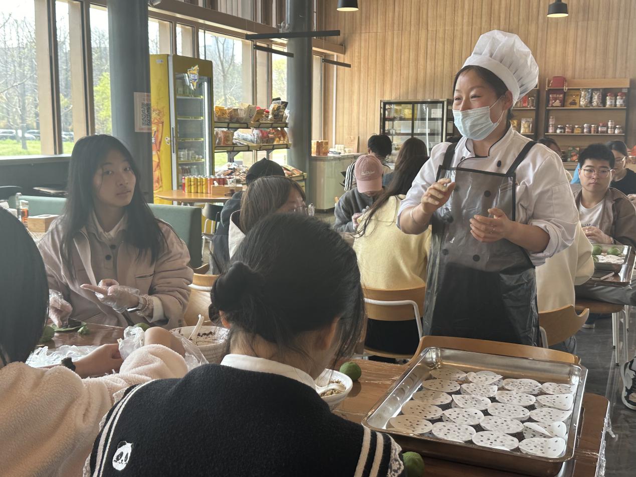 活动现场,翠绿的艾草面团与豆沙、咸肉笋丁馅料整齐陈列。面点师傅现场演示揉面、分剂、擀皮、包馅等步骤,强调“面皮厚薄均匀,收口力道轻柔”的操作要点。“甜馅包圆,咸馅捏尖,这是祖辈传下的老讲究。”通过面点师傅手把手指导,同学们分组操作,揉搓面团、填馅塑形,沉浸式体验传统手艺。经过20多分钟蒸制,青团的清香弥漫整个餐厅。同学们品尝着自己制作的青团,劳动成果的甘甜与文化解码的满足感在舌尖交织。