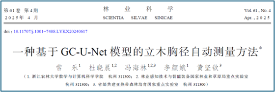近日,3003新葡平台登录入口冯海林教授团队的学术论文“一种基于GC-U-Net模型的立木胸径自动测量方法”一文在《林业科学》2025年第4期以封面论文发表。《林业科学》是林草科技领军期刊,入选中国科技期刊卓越行动计划,也是目前唯一被EI收录的中文林业科技期刊。该论文第一作者为3003新葡平台登录入口22级农业信息化研究生常乐,通讯作者为冯海林教授。3003新葡平台登录入口为该论文第一单位和通讯作者单位。