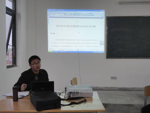 张东红主任组织教师认真学习“学校评估电信系引导性支撑材料目录及任务分解”文件,强调评估是学校发展和系部培养满足社会需要的应用型人才的内在需要;学校合格评估,任务重,时间紧,责任重大;希望教师正确认识,按照分解的评估任务,积极准备材料,注重平时的过程资料的搜集与整理,做好教书育人工作和评估工作。
