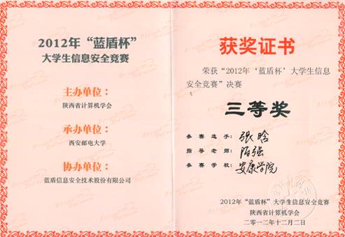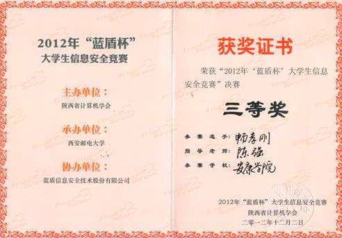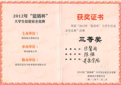 2012122,由陕西省计算机学会主办、西安邮电大学承办的“首届‘蓝盾杯’网络与信息安全攻防邀请赛”中,我院学生喜获佳绩。