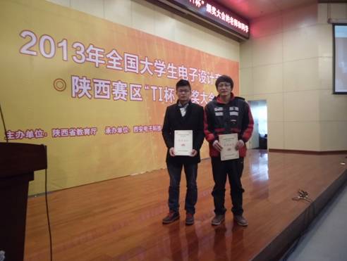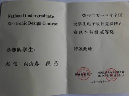 1229,全国大学生电子设计竞赛陕西赛区颁奖典礼在西安电子科技大学新校区举行,我校电子信息工程专业11级学生赵倡、段亮、向海春同学制作的手写绘图板(G题)获得本科组二等奖,所取得的成绩是我校2009年参加的三届全国大学生电子设计竞赛以来最好的一届,是我校首次在本科组获得该项赛事的奖项。