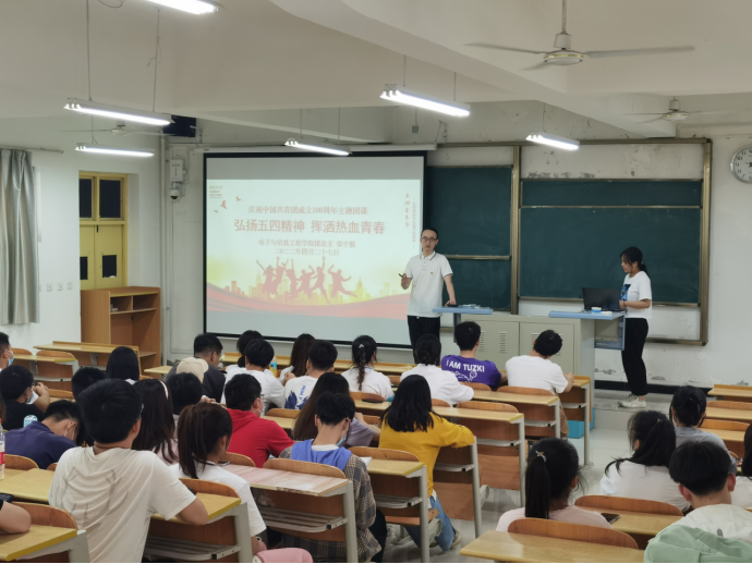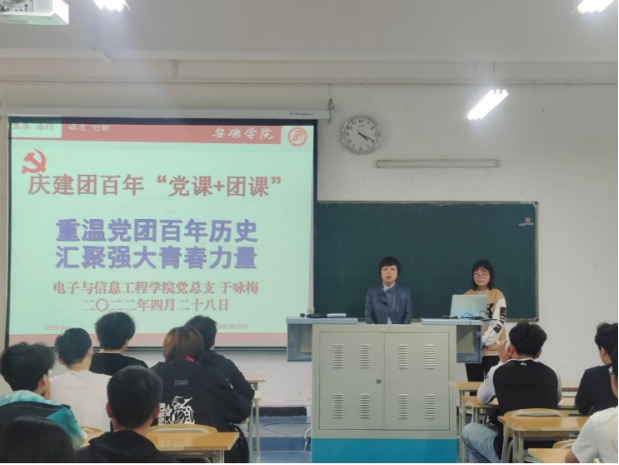 坚持党建带团建 为激发Beat365中文官方网站广大团员青年爱党、爱国情怀,实现党建带团建的目标,培养电信学子践行社会主义核心价值观,以昂扬的斗志和精神状态庆祝建团百年,迎接党的二十大胜利召开,4月28日,Beat365中文官方网站党总支书记于咏梅在1307教室以“重温党团历史,汇聚强大力量”为主题,为电信学子上了一堂生动的主题“党课+团课”。