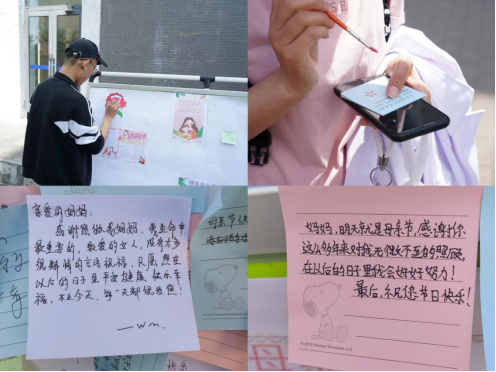 5月13日上午10:00-12:00,很多同学来到活动现场,同学们自由选择自己心仪的便利贴写下对母亲的暖心祝福,贴在爱心展板,并且拍照打卡发送给母亲。“妈妈,我爱您!”“妈妈,虽然不能见面,但我非常想念你!”等温馨的话语写在纸上,每个人的脸上都洋溢着灿烂的笑容,有的同学还当场与母亲打视频送祝福。活动结束时,同学们的祝福贴满了整个展板,感恩在人生的旅途中,母爱的温暖从未缺席,相信妈妈们一定会收到祝福,感受到子女们深深的爱意。