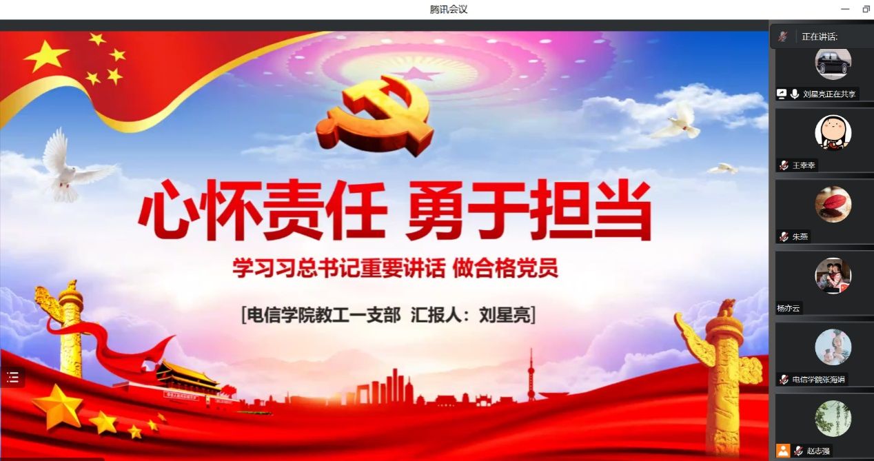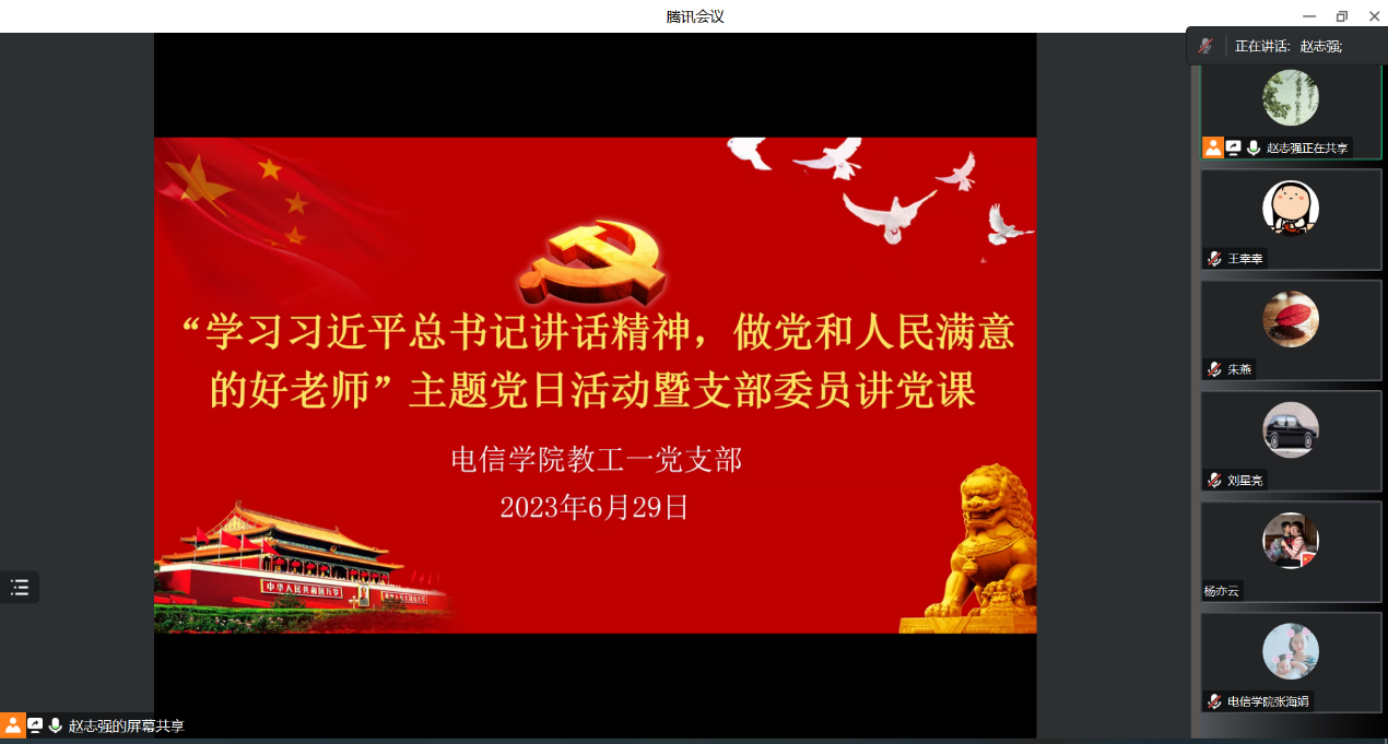 2023年6月29日19:30,Beat365中文官方网站教工第一党支部通过腾讯会议开展“学习习近平总书记讲话精神,做党和人民满意的好老师”主题党日活动暨支部委员讲党课。活动由教工第一党支部书记赵志强主持,支部全体党员参加本次活动。