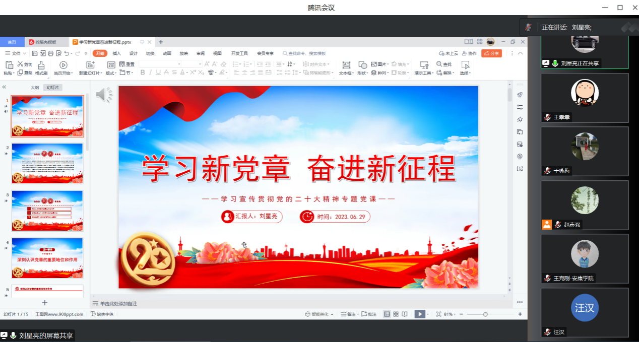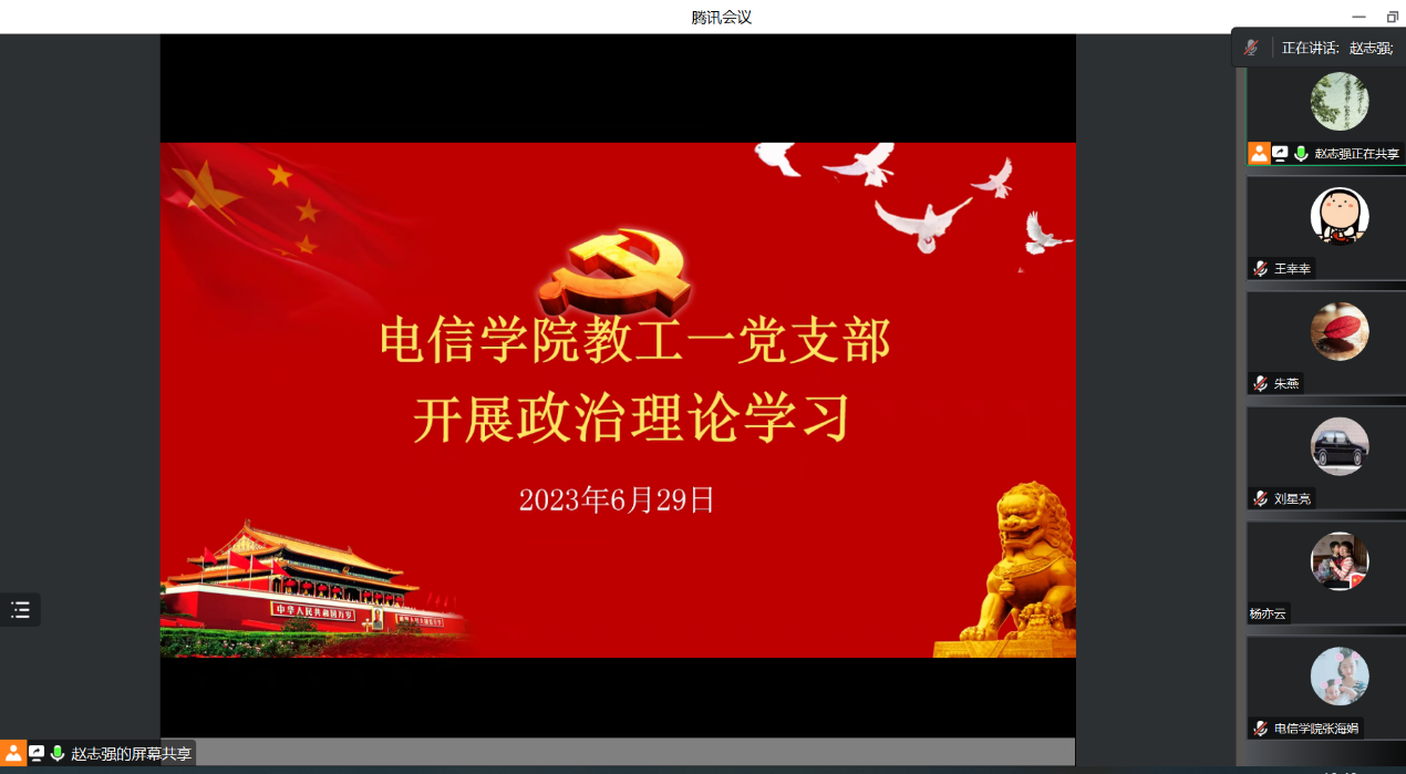 2023年6月29日晚,Beat365中文官方网站教工第一党支部通过腾讯会议开展纪律教育暨政治理论学习,会议由教工第一党支部书记赵志强主持,支部全体党员参加本次会议。