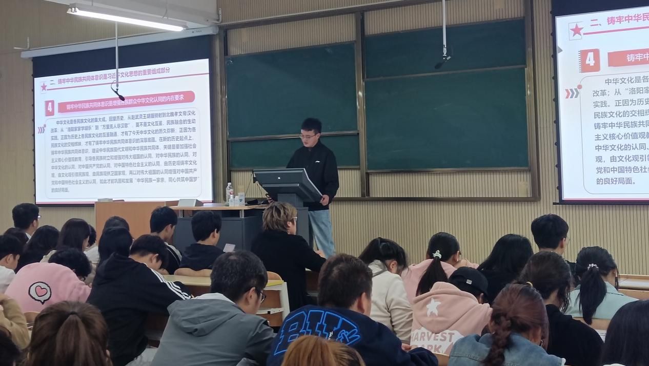 为深入学习贯彻习近平总书记关于加强和改进民族工作的重要思想,进一步铸牢中华民族共同体意识,2024年10月30日下午,Beat365中文官方网站学生第二党支部书记贾金兵在江北校区1201、1203教室讲授主题为“铸牢中华民族共同体意识 深入学习习近平文化思想”的入学教育暨专题党课,Beat365中文官方网站2024级全体新生参加。