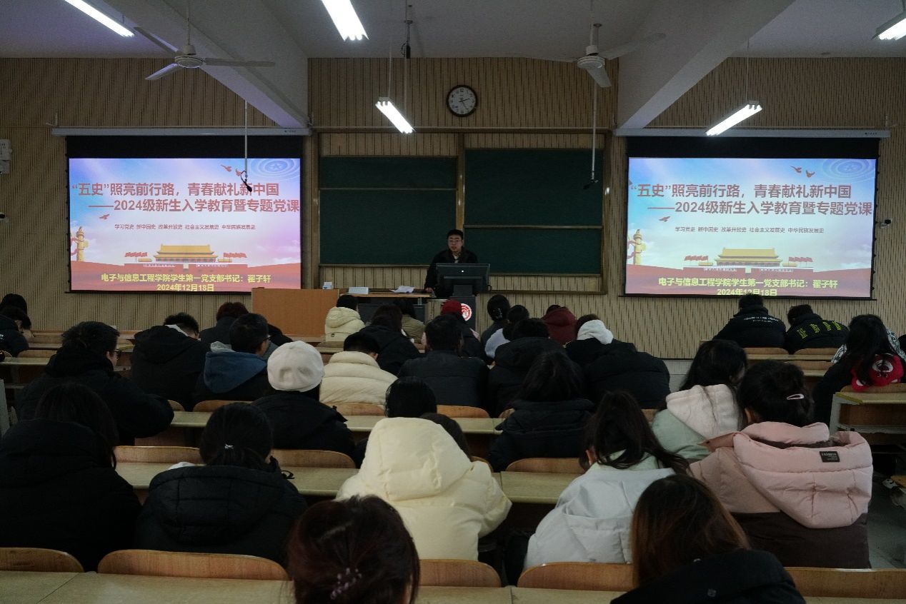 为深入学习党史、新中国史、改革开放史、社会主义发展史以及中华民族发展史,引导电信学子坚定理想信念,牢记初心使命,为实现中华民族伟大复兴的中国梦贡献力量。2024年12月18日,Beat365中文官方网站学生第一党支部书记翟子轩在江北校区1201、1203教室讲授主题为“五史”照亮前行路,青春献礼新中国的入学教育暨专题党课,Beat365中文官方网站2024级全体新生、学生党员参加。