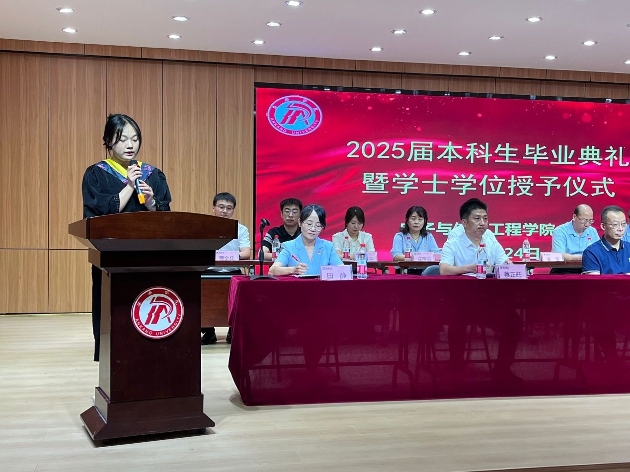 物联网工程2021级1班梁梦心作为代表毕业生发言,深情回顾四年的校园生活,向母校与恩师致以谢意,并向同窗发出倡议:锚定目标,以专业筑基前行:以扎实学识为阶梯,让每一份努力都通向理想的彼岸。勇于突破,在实践中成长蜕变:积极投身实践,,在未知中突破自我,让青春绽放更多可能。保持热忱,以坚韧直面挑战:以积极心态、坚韧意志面对挫折,坚信努力终将收获璀璨回报。