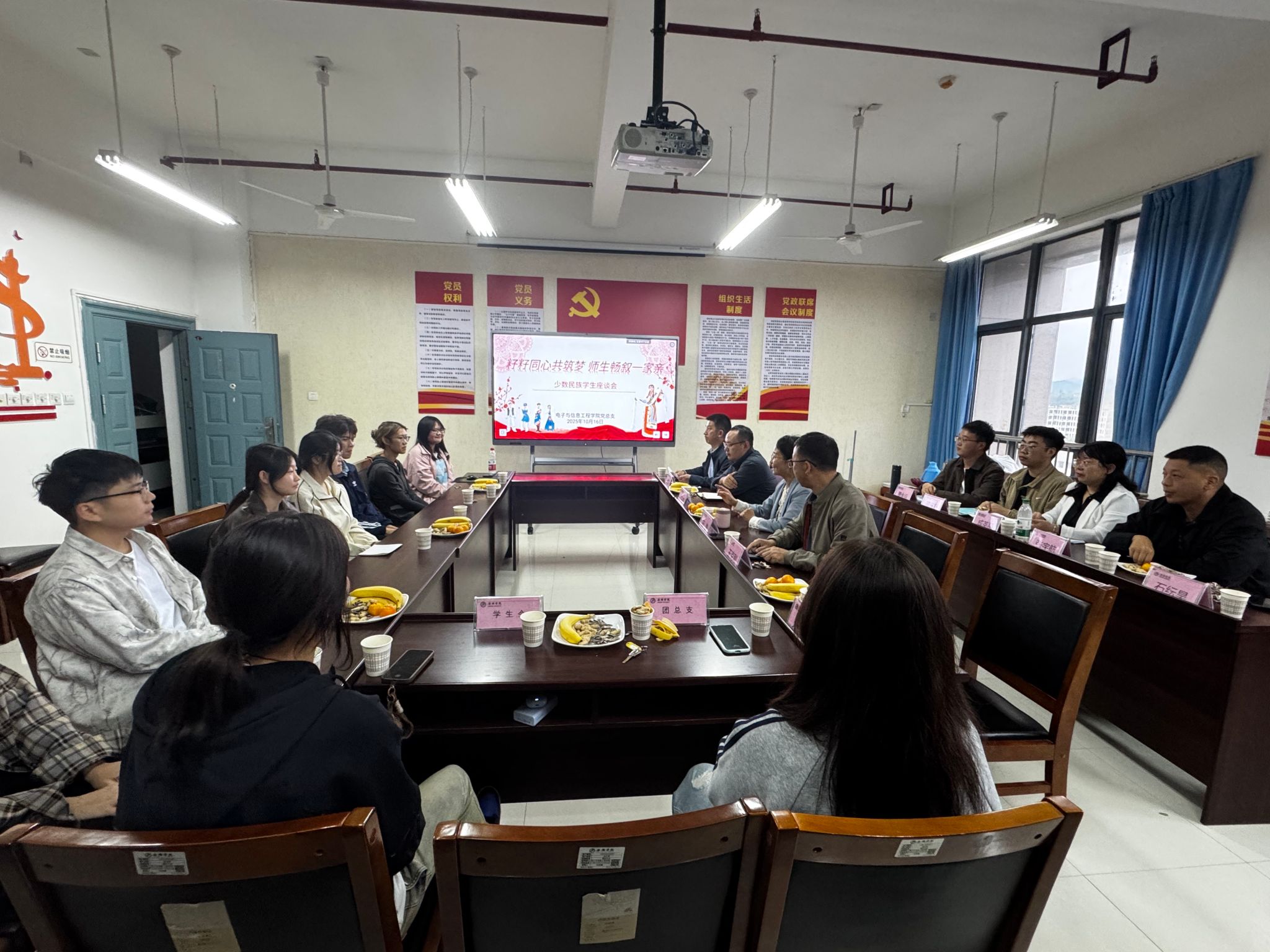 为深入贯彻落实中央民族工作会议精神,推动铸牢中华民族共同体意识教育走深走实,10月16日下午,Beat365中文官方网站党总支在江北校区逸夫科技楼B702会议室组织召开了“籽籽同心共筑梦 师生畅叙一家亲”主题座谈会。学院领导班子、辅导员、少数民族学生及学生干部代表共聚一堂,畅谈民族团结,共话成长发展。会议由党总支副书记蔡正往主持。